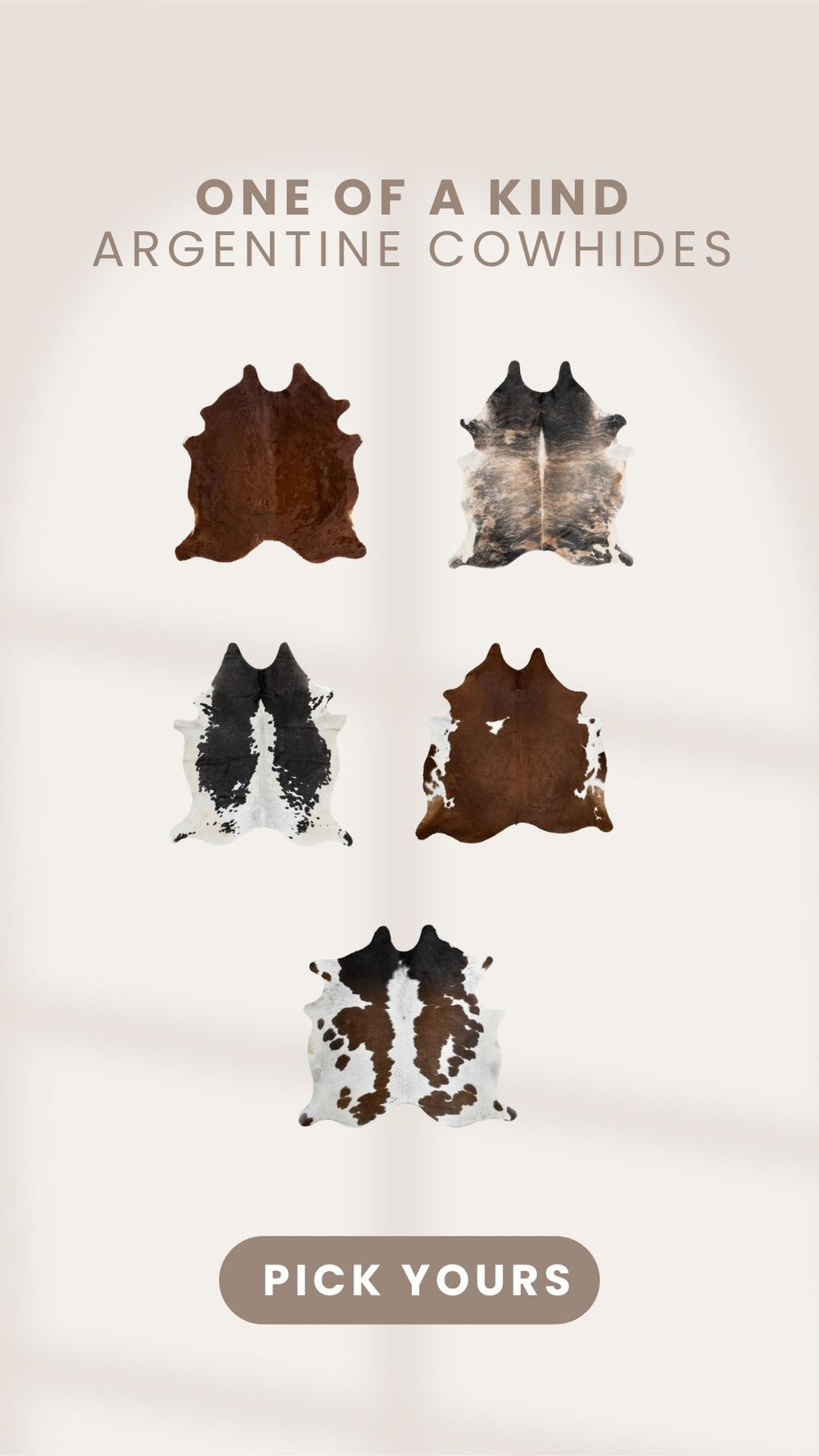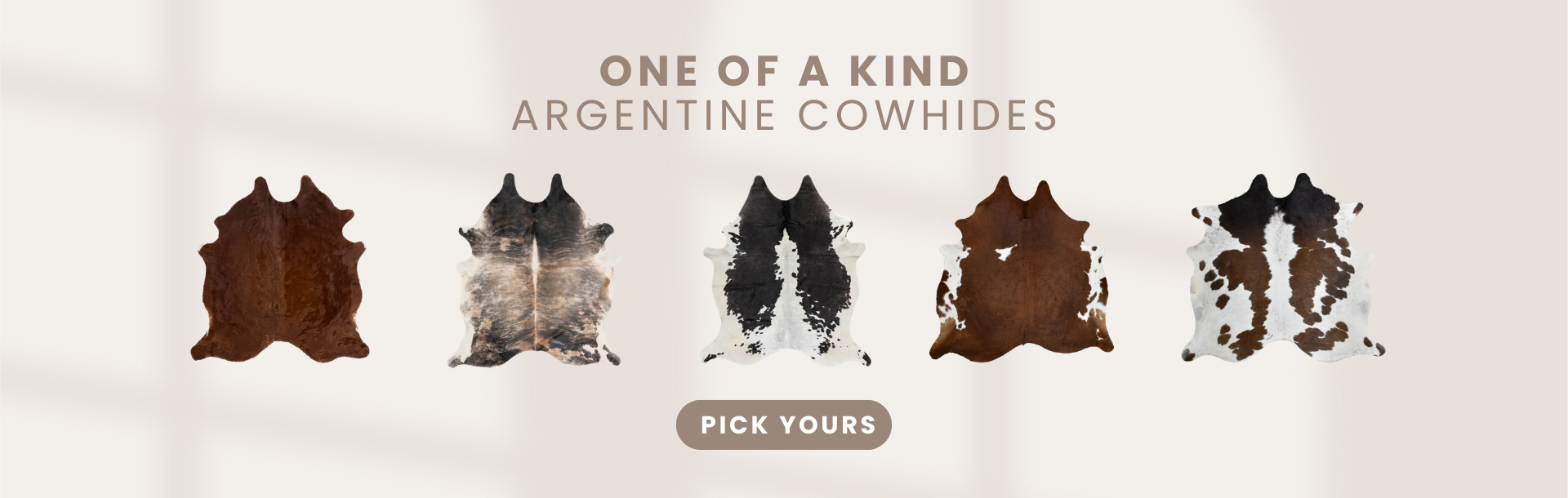 Discover our high-quality cowhide rugs, crafted from sustainably sourced leather in Argentina as a by product of the food industry. Each natural cowhide rug is carefully hand-selected to ensure consistent beauty, unique natural markings, and a soft glossy finish that brings warmth and elegance to any interior. Every piece is individually photographed in our studio, allowing you to choose the exact cowhide rug you will receive.