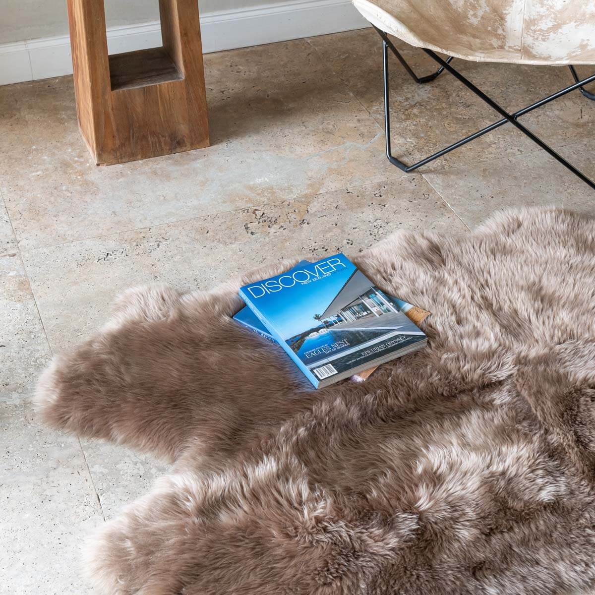 The Khara Home "Quatro" 100% genuine sheepskin area rug is the perfect balance of elegance and comfort. This exceptional creation combines four single pelt sheepskin hides into a single piece of extraordinary quality, measuring 6' x 4'
